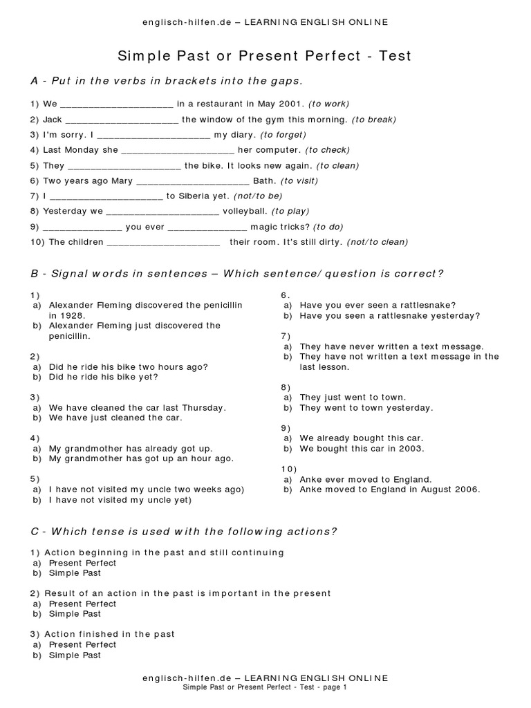 Test Present Perfect En Pdf Englisch Hilfen De Learning English Online Present Perfect Test A Put In The Correct Verb Forms 1 They Listened A Has B Course Hero